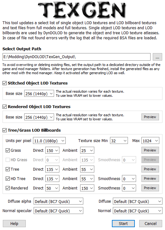 https://imgbox.com/g/zGQAAwK2FW https://vimeo.com/manage/videos/1132434675 I don't see a difference personally. The one with grass is the previous output and the one without is the new output. Here are the logs from this version: https://limewire.com/d/etTx5#zaHozyTVTM I have another issue, it seems like Texgen generates grass lod textures seemingly randomly every time. For example, grass record groundcover.esp;00000819;t_grass_big02 sometimes gets flagged as ",false" and sometimes not. Sometimes a texgen output will have 315 grass lod files generated and sometimes it'll be 215. I have MinGrassModelVolume=0 and MinGrassModelHeight=0 in Texgen_SSE.ini because I think Texgen was ignoring the grass records of that mod because it's object bounds are weird? I recalculated them in CK and nothing changed(they were already calculated) until I set both of these to =0 but now they're being generated randomly I think. The grass mod: https://www.nexusmods.com/skyrimspecialedition/mods/139896?tab=description I generated 2 new Texgen Outputs right now using 196 and these are the results: First one: https://justpaste.it/41ymd and its logs: https://limewire.com/d/54fqR#ZlIln1Z8gT Second one: https://justpaste.it/4zy6a and its logs: https://limewire.com/d/59ViO#Y4riaVBo7D I noticed this because one time I didn't have any tundra grass despite generating grass lods. I ended up saving the grass lod files from the texgen output that had the most amount after several tries.