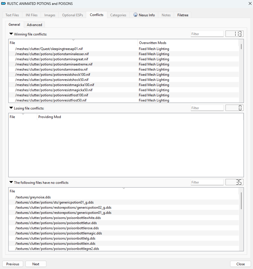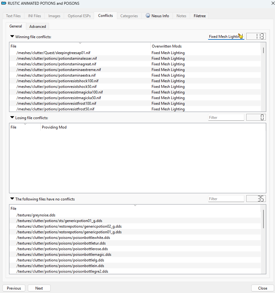 I came to this thread to ask the same question as I ended up hiding everything when I filtered the winning conflicts for "Fixed Mesh Lighting" as well. Should we all have enable archives parsing turned on? edit: Just to add I believe it's turned off by default as I didn't know it was a setting till I saw this so perhaps a mention in the setup guide.