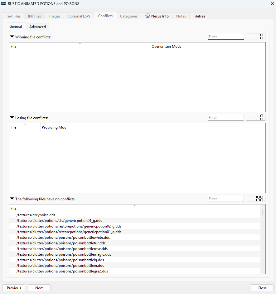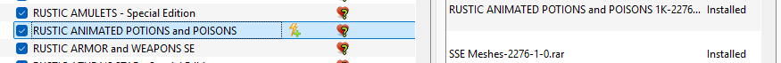 Btw, I was using the versions the guide told me to use, i.e.: RUSTIC ANIMATED POTIONS and POISONS 1K main file and SSE Meshes update file (both v 1.1 at the time of downloading).