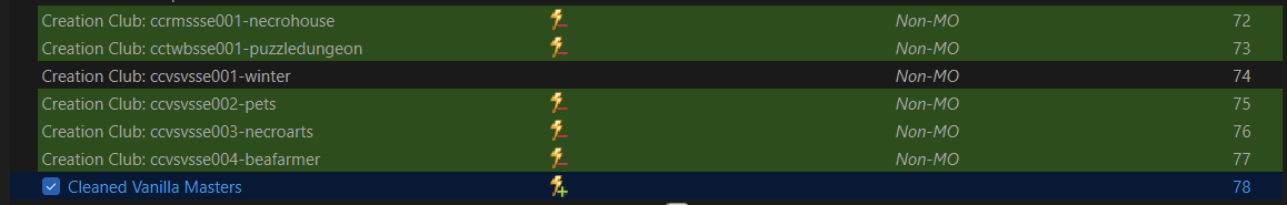 Then have a look at the game \Data folder to make certain you have the 80 vanilla ESM files. TIP: click on Type file header in Windows Explorer to sort by Type. Then select all of the ESM files to see the count in the lower left footer of Explorer.