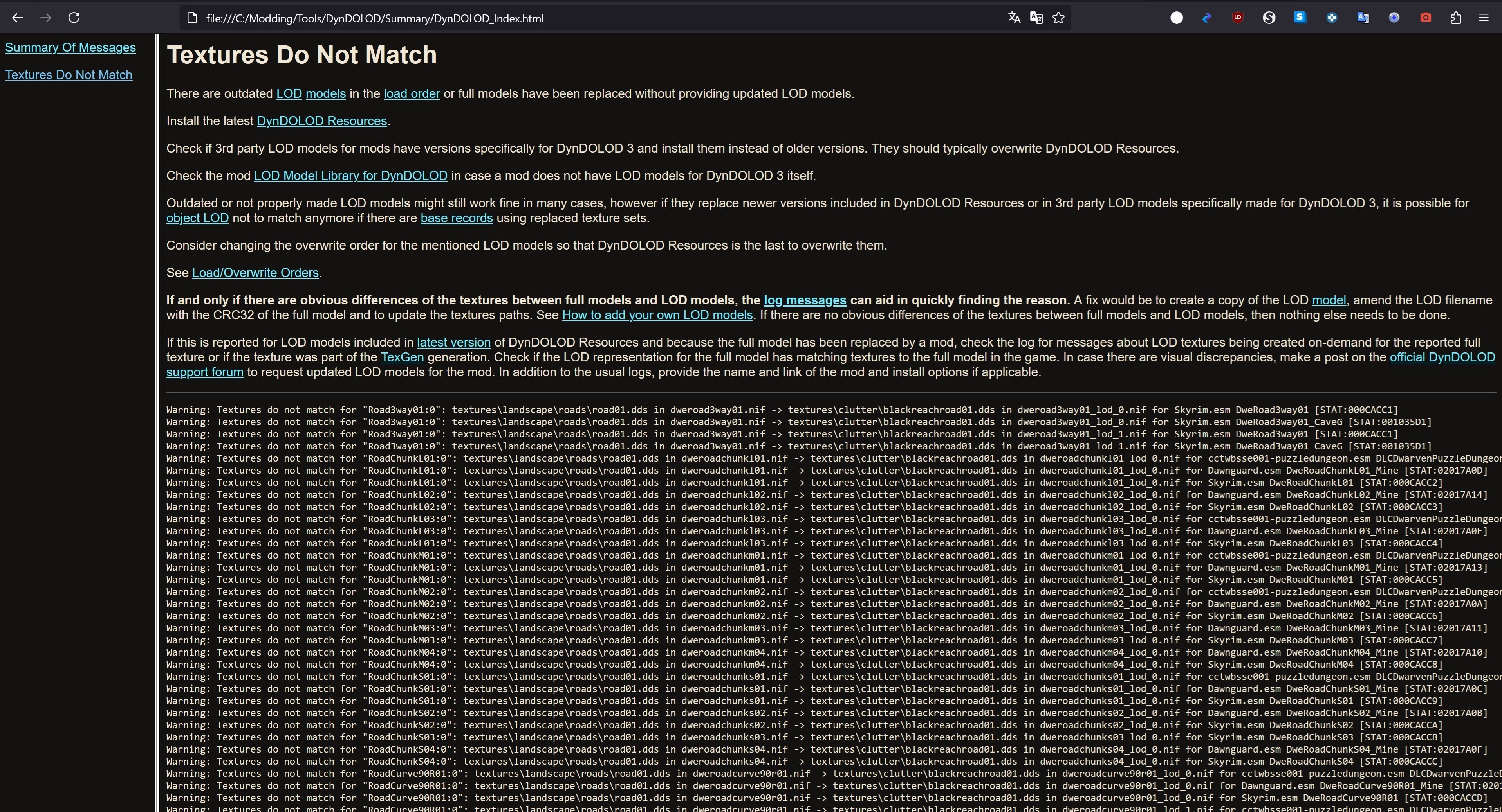 At this stage, I feel like I'm close to finishing the STEP v2.3 build on my end. I've already run the terrain LOD generation, TexGen and DynDoLOD itself as well. Regarding DyndoLOD, I've got a report after the LOD generation process has finished that warns me about some 50 to 100 textures that do not match. I'm attaching a screenshot with the first half of the report, but the list of affected textures is longer than what you can see there. I can upload the report itself, in case you want/need to have a look at it.
