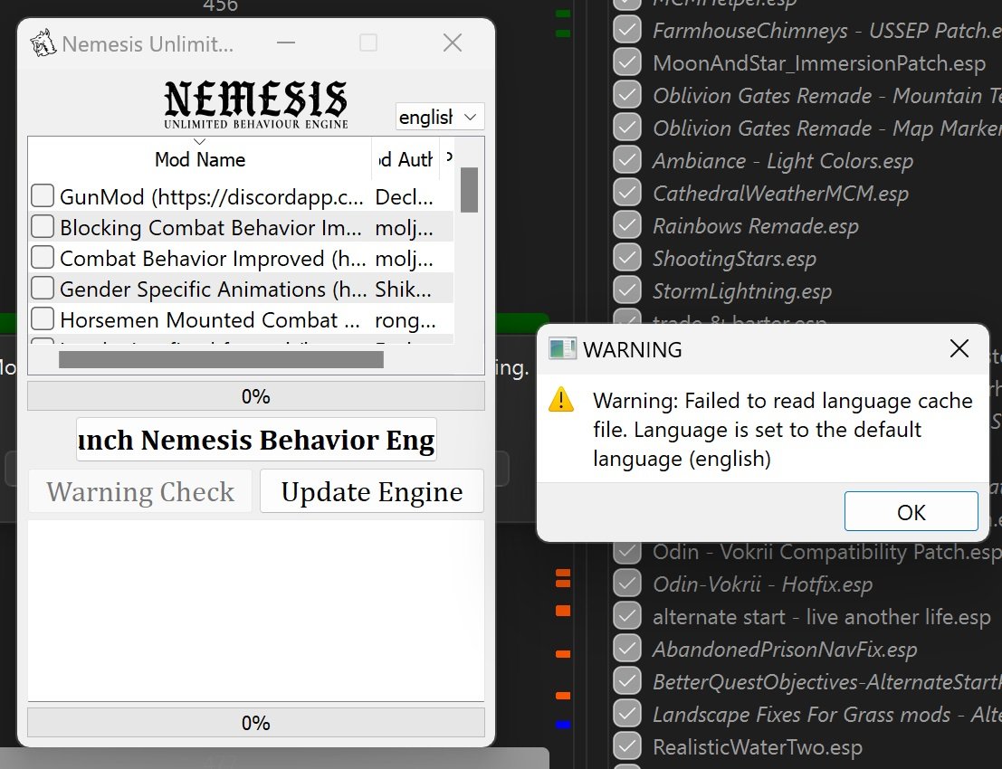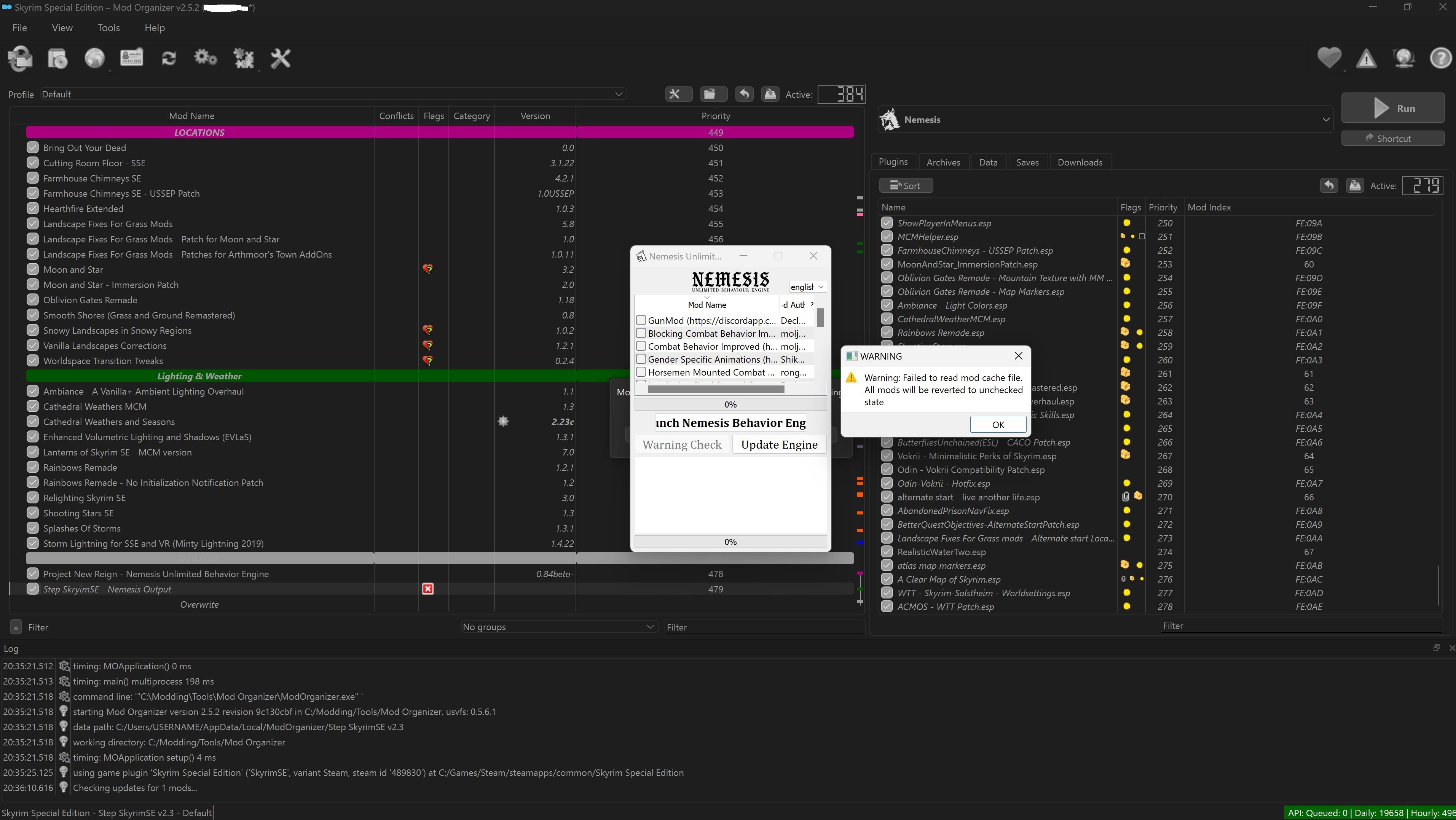 A bit later in that section of the guide (19 Utilities), I'm also finding some issues when I run Nemesis (as instructed in the guide). Specifically, I'm getting two warnings upon running the application from within Mod Organizer. I'm attaching a couple of screenshots where you can see both warnings. How should I proceed?